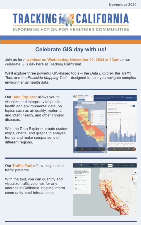 Tracking California hosted a webinar on Wednesday November 20, 2024 to celebrate GIS Day focused on two tools: