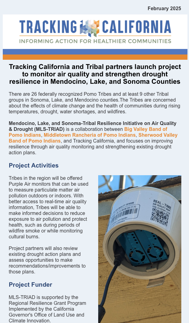 The Mendocino, Lake, Sonoma - Tribal Resilience Initiative on Air Quality & Drought (MLS-TRIAD) is a collaboration between Big Valley Band of Pomo Indians, Middletown Rancheria of Pomo Indians, Sherwood Valley Band of Pomo Indians, and Tracking California, and focuses on improving resilience through air quality monitoring and strengthening existing drought action plans.