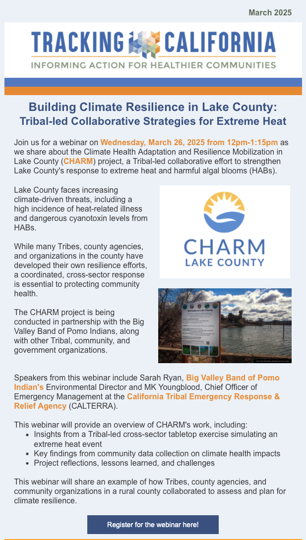 Tracking California hosted a webinar on Wednesday March 26, 2025 to share about the Climate and Health Adaptation and Resilience Mobilization in Lake County (CHARM) project, a Tribal-led collaborative effort to strengthen Lake County's response to extreme heat and harmful algal blooms (HABs).