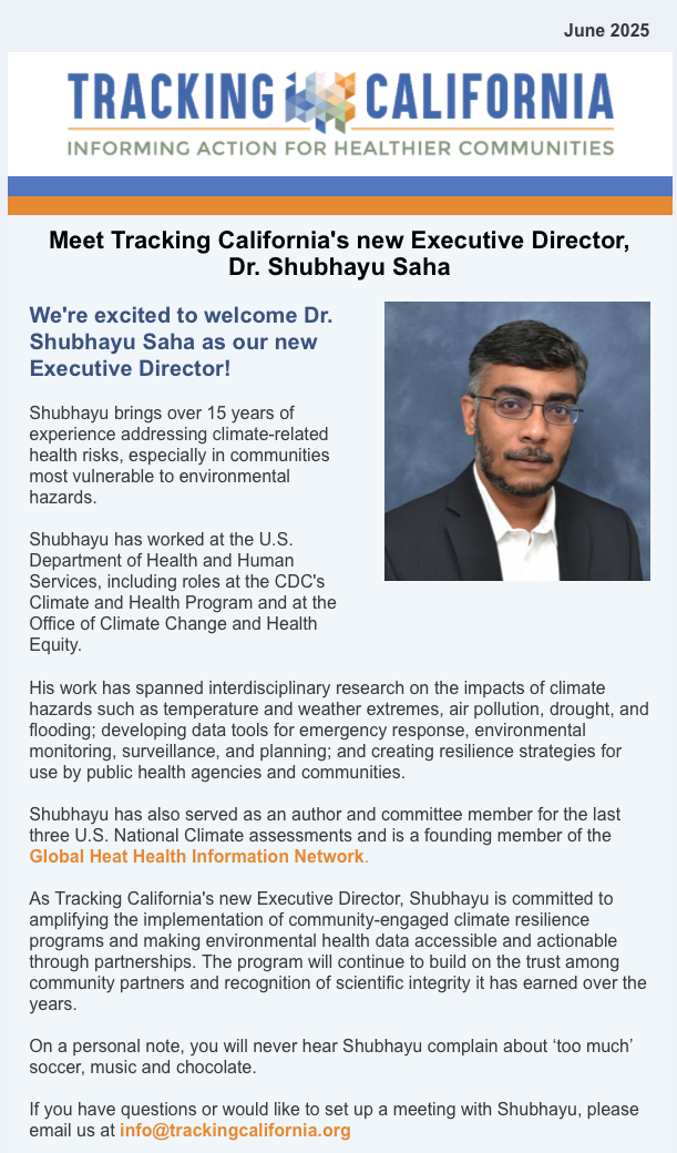 Shubhayu Saha, Tracking California's new Executive Director, brings over 15 years of experience addressing climate-related health risks, especially in communities most vulnerable to environmental hazards.