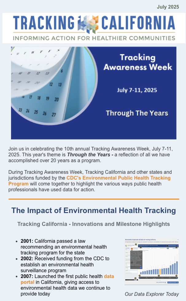 It's Tracking Awareness Week! The five days in July where we join the other CDC Environmental Health Tracking grantees to share our work. Each day this week is dedicated to an environmental health tracking theme: unique data, expanding partnerships, COVID-19, environmental justice, and celebrating successes.